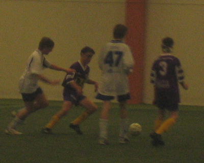matchen spelades klockan 11.40 och den gick mellan Grunden Bois vit och Andra matchen var det Grunden Bois blå som mötte ett taggat Fässberg IF. Alla gjorde en rejäl kämpainsats och trots ett snyggt mål av de blåa vann Fässberg IF med 3-1. Tredje matchen i gruppen var oerhört jämn och underhållande. Den spelades mellan Fässberg och de vita. Efter ett kämpigt underläge med 0-2 för Grunden Bois lyckades de dundra in, inte bara ett reduceringsmål utan också ett kvitteringsmål till 2-2 som också blev slutresultatet. Grunden Bois deltog även i den fjärde matchen, nu med det blåa laget. De mötte Änglarna som verkligen hade ställt in siktet mot mål. Med sina, kanske aningen mer utvilade ben sköt de in så många som 13 bollar i Grunden Bois mål. 13-1 till Änglarna blev slutresultatet efter en ganska kämpig match för de lite yngre killarna i de blåa tröjorna. Men - det var ett ruggigt snyggt mål!!! Med trötta ben, bara 5 minuter senare, mötte blåa laget det vita laget. Niklas hade återigen tagit på sig målvaktshandskarna för de blåa, och trots slutresultatet som blev 8-2 till de vita gjorde han och hans blåa lagkamrater en jättebra match. Det är inte alla som klarar av att spela tre matcher, nästan i rad, och ändå göra en sån grym kämpainsats. Sista